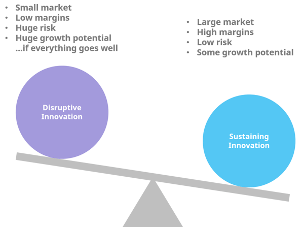 In other words, disruptive innovation initially caters to only a small and not-very-profitable customer base, which is why established companies with rational decision-making processes usually decide not to invest in these disruptive initiatives in the early stages.
